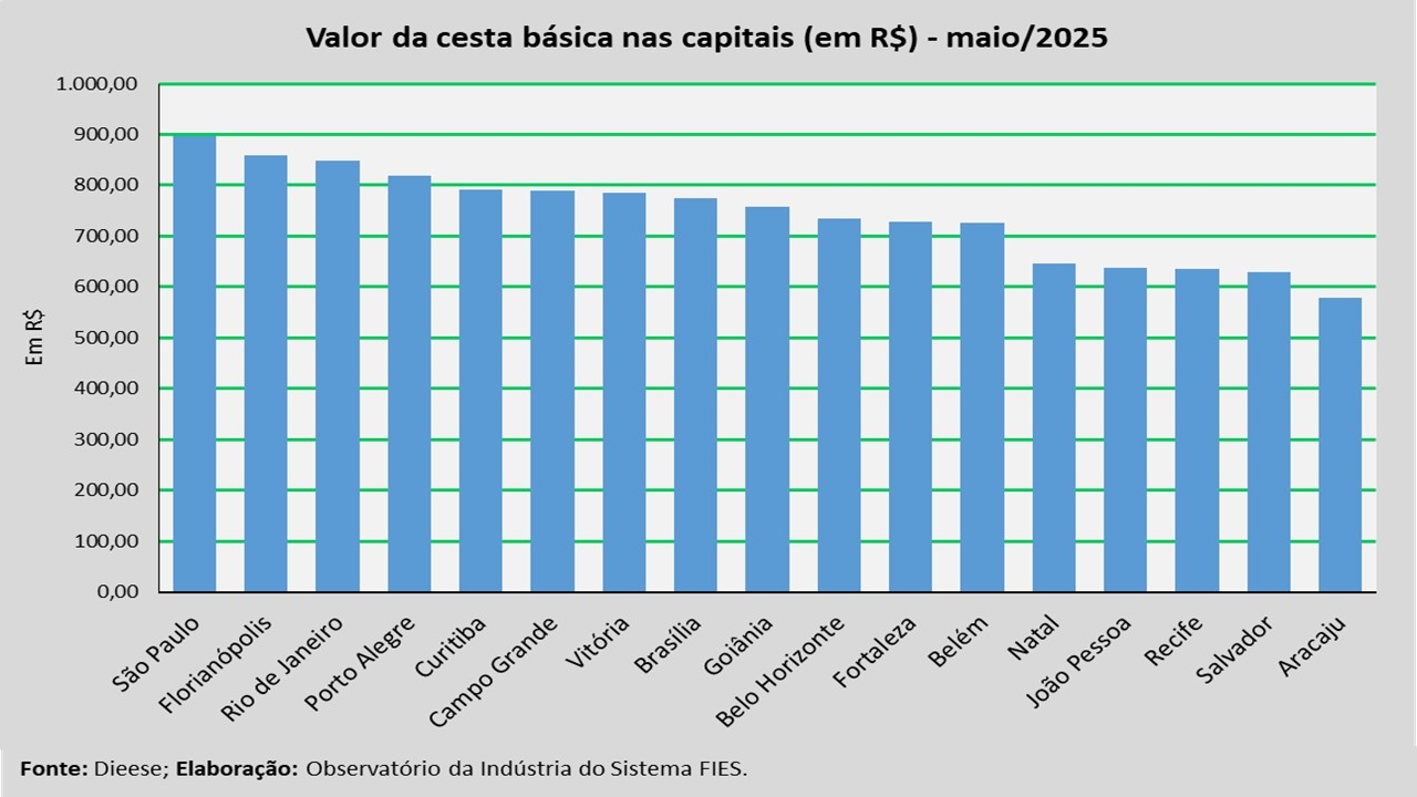 Análise realizada pelo Observatório da Indústria do Sistema FIES, com base nos dados da Pesquisa Nacional da Cesta Básica, realizada pelo Departamento Intersindical de Estatística e Estudos Socioeconômicos (DIEESE), revelou que, em maio, o valor médio da cesta básica na capital sergipana ficou em R$ 579,54, o menor custo dentre as capitais pesquisadas.