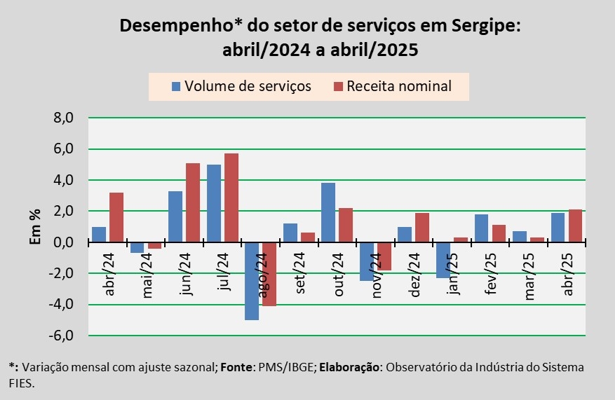 Análise realizada pelo Observatório da Indústria do Sistema FIES, com base nos dados da Pesquisa Mensal de Serviços (PMS) do IBGE, revelou que, em abril, o setor de serviços em Sergipe apresentou aumento de 1,9% no volume de serviços prestados, em relação ao último mês de março, na série com ajuste sazonal (método utilizado para uniformizar os períodos de comparação). Na comparação com abril de 2024, o volume de serviços assinalou crescimento de 8,3%. Já no acumulado dos últimos doze meses, o aumento registrado foi de 8,5%.