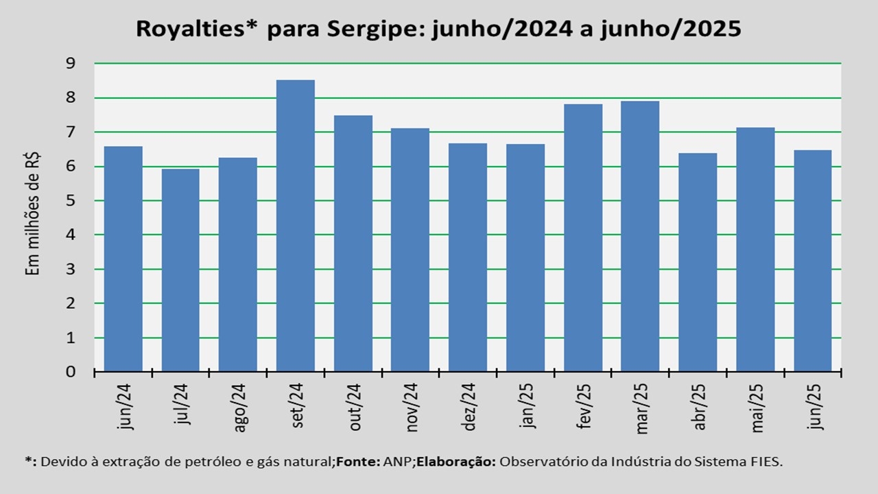 Os royalties creditados ao estado de Sergipe de janeiro a junho de 2025 acumularam cerca de R$ 42,4 milhões. O montante acumulado no primeiro semestre do ano foi 24,4% maior que o acumulado no mesmo período de 2024.