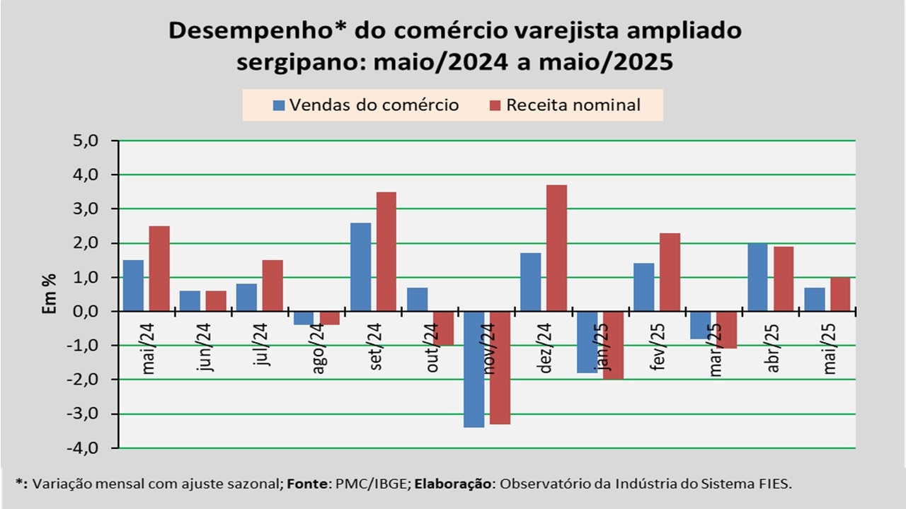 Análise realizada pelo Observatório da Indústria do Sistema FIES, com base nos dados da Pesquisa Mensal do Comércio (PMC) do IBGE, apontou que as vendas do comércio varejista ampliado sergipano, em maio de 2025, assinalaram um acréscimo de 0,7%, em relação ao mês imediatamente anterior (abril/2025), na série com ajuste sazonal (método que uniformiza os períodos de comparação). No comparativo com maio de 2024, observou-se um aumento de 3,4%. Já no acumulado dos últimos doze meses, foi registrado um crescimento de 3,0%.