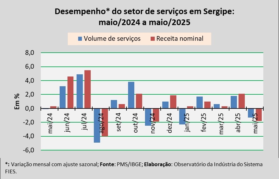 Análise realizada pelo Observatório da Indústria do Sistema FIES, com base nos dados da Pesquisa Mensal de Serviços (PMS) do IBGE, revelou que, em maio, o setor de serviços em Sergipe apresentou decréscimo de 1,3% no volume de serviços prestados, em relação ao último mês de abril, na série com ajuste sazonal (método utilizado para uniformizar os períodos de comparação). Na comparação com maio de 2024, o volume de serviços assinalou crescimento de 7,1%. Já no acumulado dos últimos doze meses, o aumento registrado foi de 9,2%.