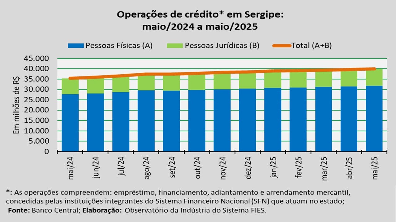 Análise realizada pelo Observatório da Indústria do Sistema FIES, com base nos dados do Banco Central, revelou que o saldo total das operações de crédito em Sergipe totalizou aproximadamente R$ 40,0 bilhões, no mês de maio de 2025.
