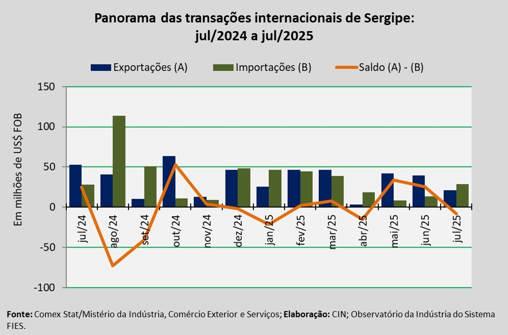 Análise realizada pelo Centro Internacional de Negócios – CIN/SE, da Federação das Indústrias do Estado de Sergipe (FIES), com base nos dados do Comex Stat, sistema para consultas e extração de dados do comércio exterior brasileiro, disponibilizado pelo Mistério da Indústria, Comércio Exterior e Serviços, apontou que as exportações sergipanas, em julho de 2025, somaram US$ 20,9 milhões. O montante registrado representa uma redução de 60,1%, quando comparado com julho de 2024. Já na comparação com o mês anterior, junho último, verificou-se decréscimo de 47,2% nas exportações do estado.