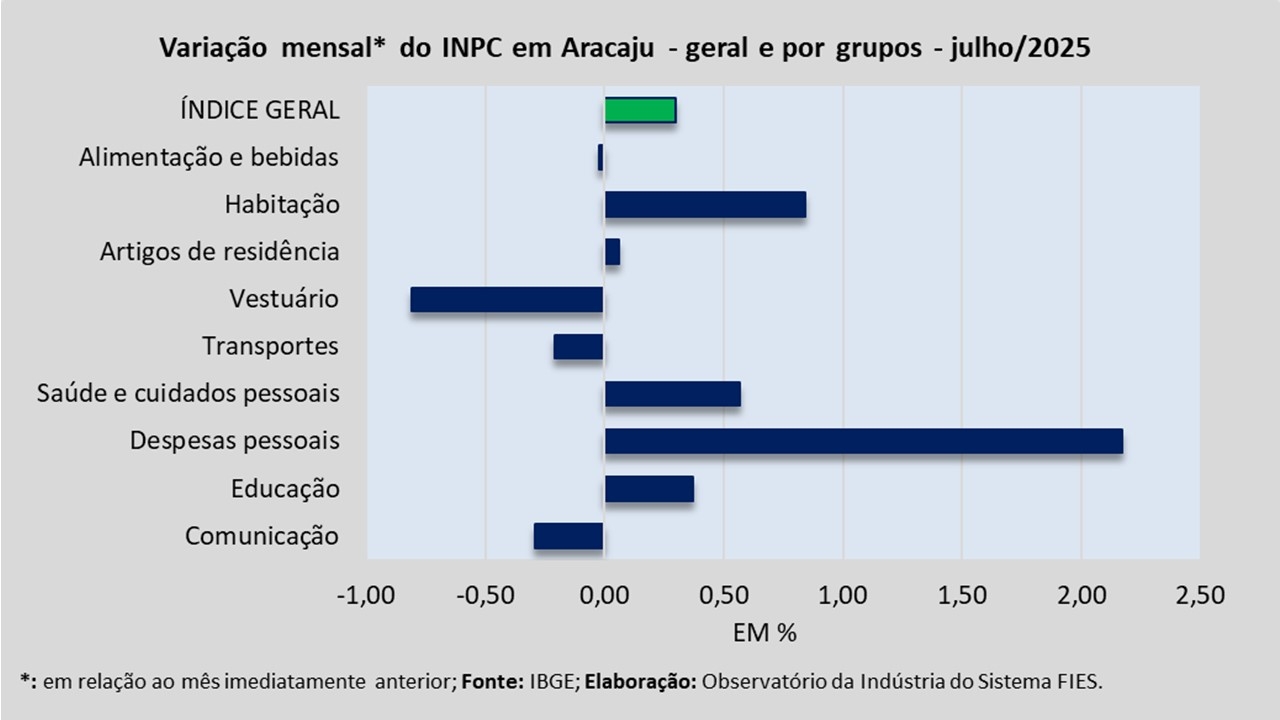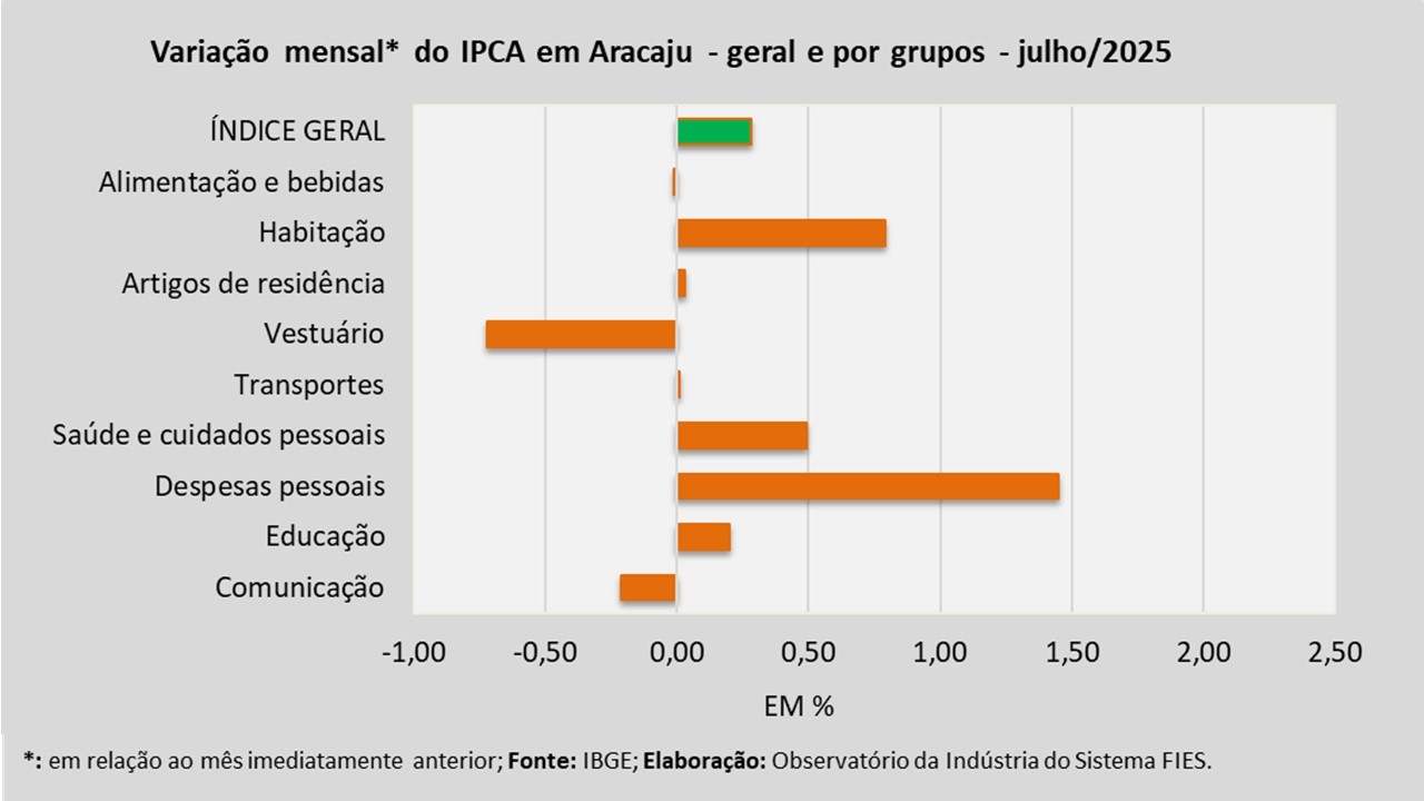 Análise realizada pelo Observatório da Indústria do Sistema FIES, com base nos dados do Instituto Brasileiro de Geografia e Estatística (IBGE), revelou que, em julho deste ano, a capital sergipana registrou inflação de 0,28%, medida pelo Índice de Preços ao Consumidor Amplo – IPCA. Com o resultado de julho, a inflação acumulada no ano de 2025 chegou a 3,74%.