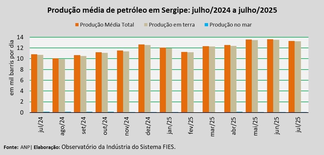 Análise realizada pelo Observatório da Indústria do Sistema FIES, com base nos dados da Agência Nacional do Petróleo, Gás Natural e Biocombustíveis (ANP), revelou que a produção de petróleo no estado, no mês de julho, alcançou a média de 13,3 mil barris por dia (bpd), registrando um decréscimo de 2,2% em relação à produção média do mês anterior (junho/2025). No comparativo com julho de 2024, verificou-se acréscimo de 22,9%.
