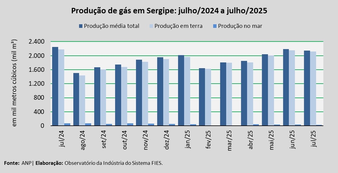 A produção em terra foi a principal fonte de produção de gás natural no estado, totalizando aproximadamente 2,12 milhões de metros cúbicos (m³), no período analisado. Esse volume correspondeu a 98,6% do total produzido em julho de 2025 no estado, ao passo que a produção em mar foi cerca de 30 mil metros cúbicos (m³), representando 1,4% da produção.