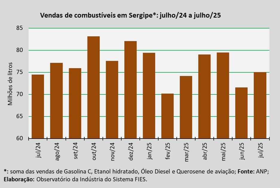 Análise realizada pelo Observatório da Indústria do Sistema FIES, com base nos dados da Agência Nacional do Petróleo, Gás Natural e Biocombustíveis (ANP), indicou que as vendas totais de combustíveis em Sergipe, em julho de 2025, somaram aproximadamente 75,1 milhões de litros, assinalando um acréscimo de 0,8% quando comparado a julho de 2024. Em relação ao mês imediatamente anterior (junho/2025), as vendas aumentaram 4,9%.