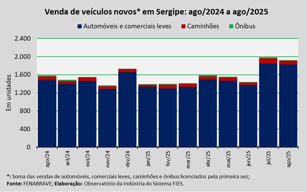 Análise realizada pelo Observatório da Indústria do Sistema FIES, com base nos dados da Federação Nacional da Distribuição de Veículos Automotores (FENABRAVE), apontou que as vendas de veículos novos no estado, no mês de agosto, totalizaram 1.924 unidades.