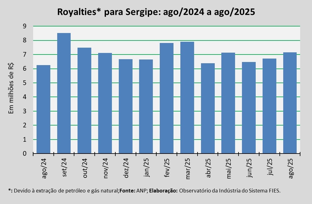 Análise realizada pelo Observatório da Indústria do Sistema FIES, com base nos dados da Agência Nacional do Petróleo, Gás Natural e Biocombustíveis (ANP), revelou que o pagamento de royalties ao Estado de Sergipe, referentes à extração de petróleo e gás natural do mês de junho último, somou cerca de R$ 7,1 milhões. O valor, segundo a ANP, foi creditado em agosto.