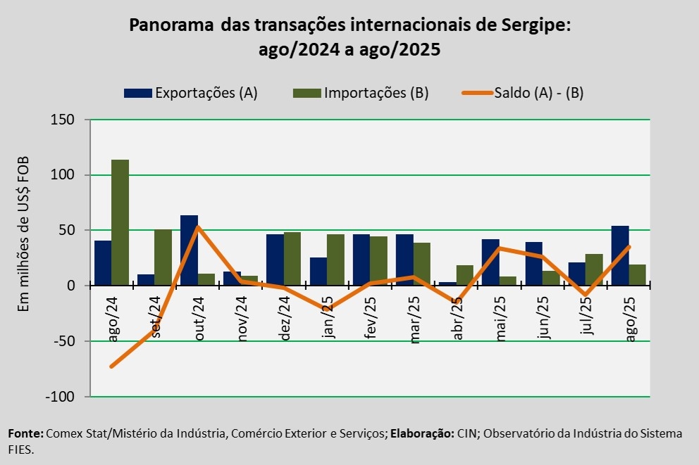Análise realizada pelo Centro Internacional de Negócios – CIN/SE, da Federação das Indústrias do Estado de Sergipe (FIES), com base nos dados do Comex Stat, sistema para consultas e extração de dados do comércio exterior brasileiro, disponibilizado pelo Mistério da Indústria, Comércio Exterior e Serviços, apontou que as exportações sergipanas, em agosto de 2025, somaram US$ 54,1 milhões. O montante registrado representa aumento de 32,1%, quando comparado com agosto de 2024. Já na comparação com o mês anterior, julho último, verificou-se acréscimo de 157,9% nas exportações do estado.