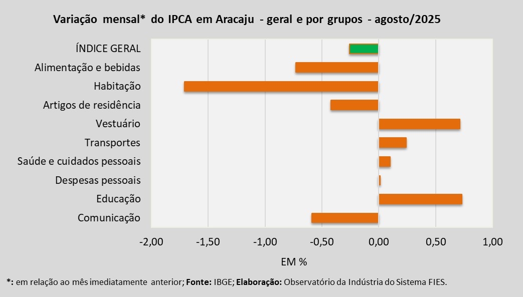 Análise realizada pelo Observatório da Indústria do Sistema FIES, com base nos dados do Instituto Brasileiro de Geografia e Estatística (IBGE), revelou que, em agosto deste ano, a capital sergipana registrou deflação de 0,26%, medida pelo Índice de Preços ao Consumidor Amplo – IPCA. A deflação é um processo inverso à inflação, ou seja, uma redução no índice de preços ao consumidor, uma queda de preços. Com o resultado de agosto, a inflação acumulada no ano de 2025 chegou a 3,48%.