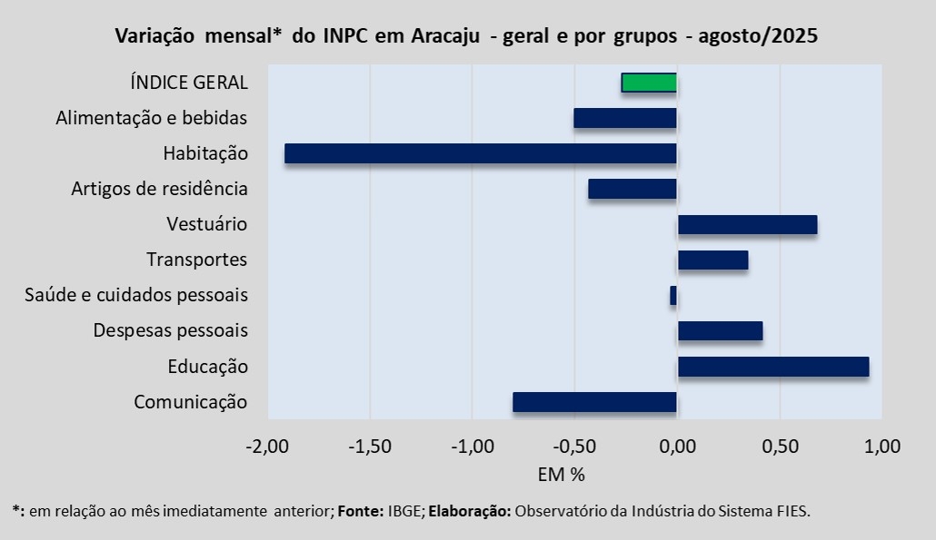 Em Aracaju, no período analisado, dos nove grupos de produtos e serviços pesquisados para medir o comportamento dos preços, quatro apresentaram deflação: Habitação (-1,71%), Alimentação e bebidas (-0,73%), Comunicação (-0,59%) e Artigos de residência (-0,42%).