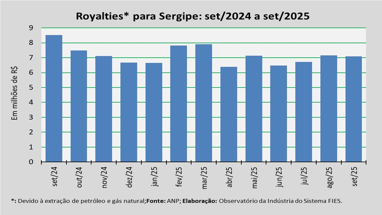 Análise realizada pelo Observatório da Indústria do Sistema FIES, com base nos dados da Agência Nacional do Petróleo, Gás Natural e Biocombustíveis (ANP), revelou que o pagamento de royalties ao Estado de Sergipe, referentes à extração de petróleo e gás natural do mês de julho último, somou cerca de R$ 7,1 milhões. O valor, segundo a ANP, foi creditado em setembro.