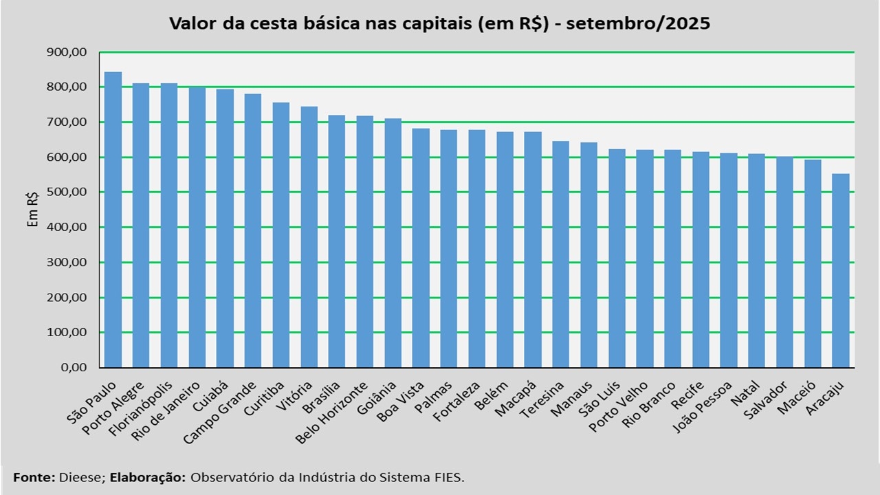 Análise realizada pelo Observatório da Indústria do Sistema FIES, com base nos dados da Pesquisa Nacional da Cesta Básica, realizada pelo Departamento Intersindical de Estatística e Estudos Socioeconômicos (DIEESE), revelou que, em setembro, o valor médio da cesta básica na capital sergipana ficou em R$ 552,65, o menor custo dentre as capitais brasileiras.
