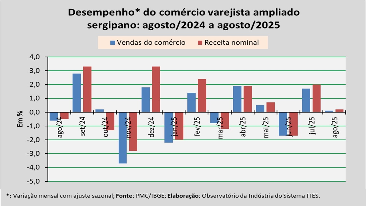 Análise realizada pelo Observatório da Indústria do Sistema FIES, com base nos dados da Pesquisa Mensal do Comércio (PMC) do IBGE, apontou que as vendas do comércio varejista ampliado sergipano, em agosto de 2025, assinalaram um acréscimo de 0,1%, em relação ao mês imediatamente anterior (julho/2025), na série com ajuste sazonal (método que uniformiza os períodos de comparação). No comparativo com agosto de 2024, registrou-se redução de 0,9% no volume de vendas. Já no acumulado dos últimos doze meses, houve crescimento de 1,8%.