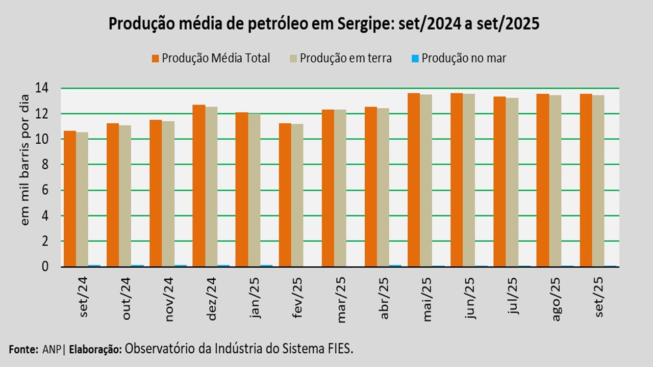 Análise realizada pelo Observatório da Indústria do Sistema FIES, com base nos dados da Agência Nacional do Petróleo, Gás Natural e Biocombustíveis (ANP), revelou que a produção de petróleo no estado, no mês de setembro, alcançou a média de 13,5 mil barris por dia (bpd), registrando um acréscimo de 0,1% em relação à produção média do mês anterior (agosto/2025). No comparativo com setembro de 2024, verificou-se acréscimo de 26,9%.