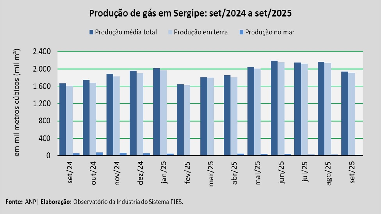 A produção em terra foi a principal fonte de produção de gás natural no estado, totalizando aproximadamente 1,91 milhão de metros cúbicos (m³), no período analisado. Esse volume correspondeu a 98,8% do total produzido em setembro de 2025 no estado, ao passo que a produção em mar foi cerca de 23 mil metros cúbicos (m³), representando 1,2% da produção.