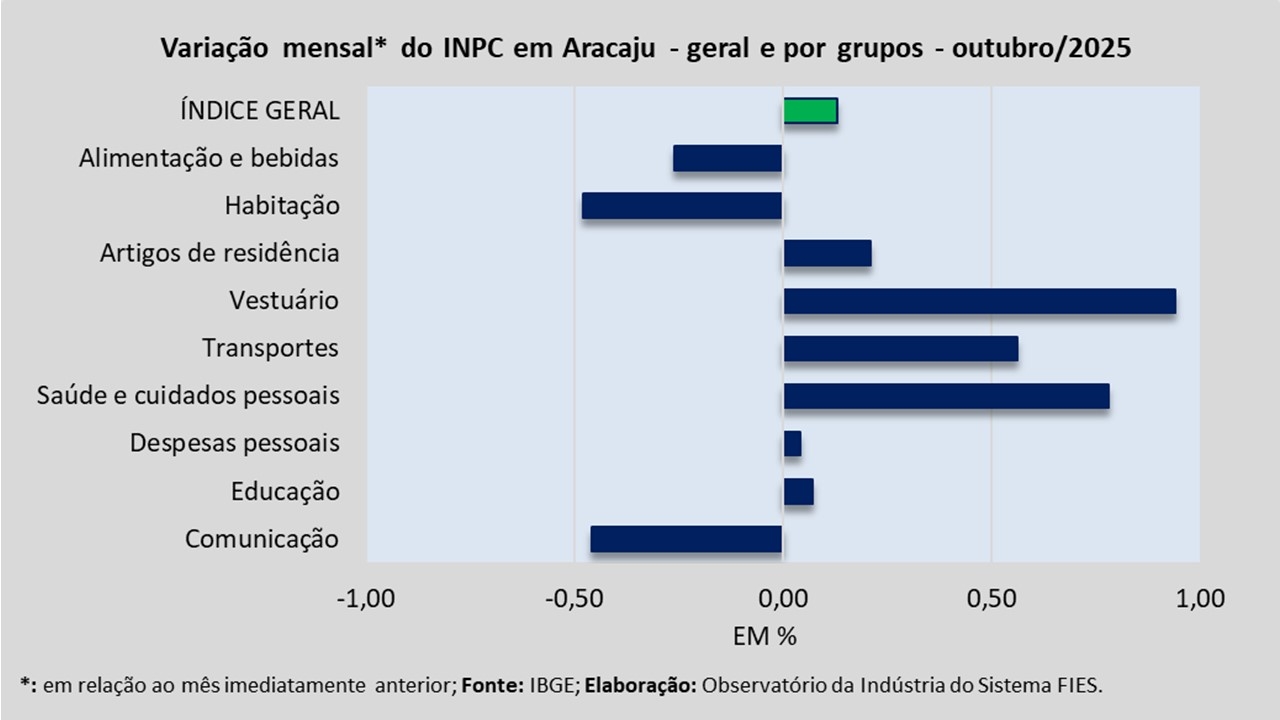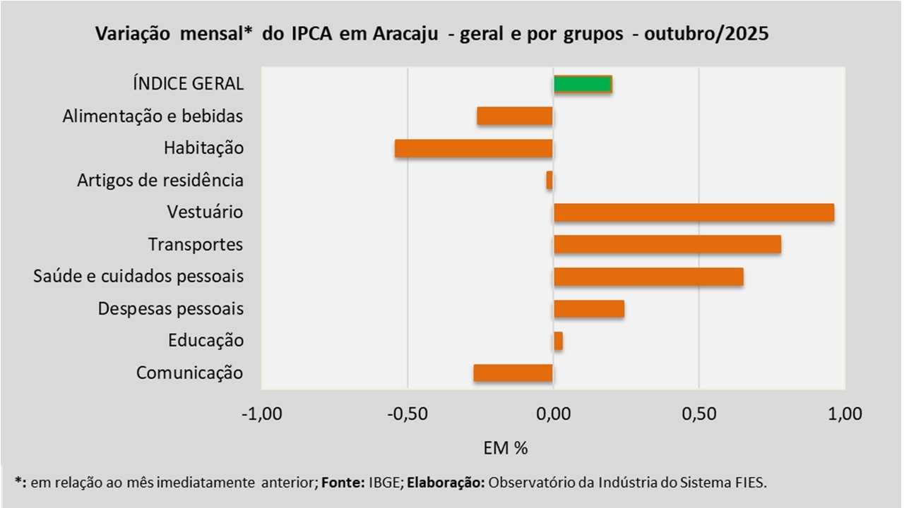 Análise realizada pelo Observatório da Indústria do Sistema FIES, com base nos dados do Instituto Brasileiro de Geografia e Estatística (IBGE), revelou que, em outubro deste ano, a capital sergipana registrou uma inflação de 0,20%, medida pelo Índice de Preços ao Consumidor Amplo – IPCA. Com o resultado de outubro, a inflação acumulada no ano de 2025 chegou a 4,22%.