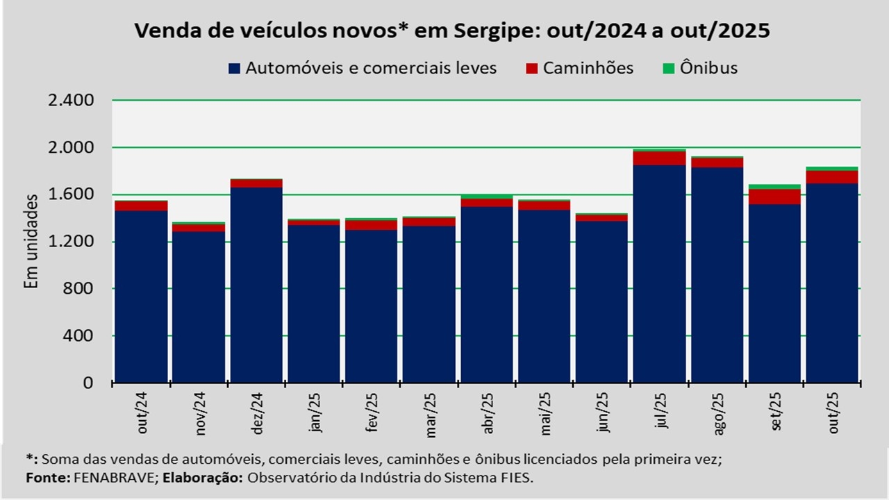 Análise realizada pelo Observatório da Indústria do Sistema FIES, com base nos dados da Federação Nacional da Distribuição de Veículos Automotores (FENABRAVE), apontou que as vendas de veículos novos no estado, no mês de outubro, totalizaram 1.838 unidades.