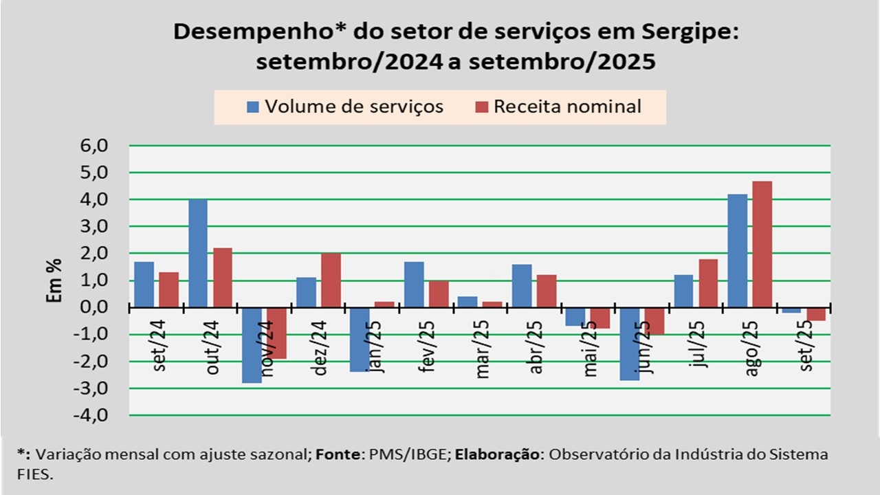 Análise realizada pelo Observatório da Indústria do Sistema FIES, com base nos dados da Pesquisa Mensal de Serviços (PMS) do IBGE, revelou que, em setembro, Sergipe registrou decréscimo de 0,2% no volume de serviços prestados, em relação ao último mês de agosto, na série com ajuste sazonal (método utilizado para uniformizar os períodos de comparação). Na comparação com setembro de 2024, o volume de serviços assinalou crescimento de 5,8%. Já no acumulado dos últimos doze meses, o aumento registrado foi de 6,4%.
