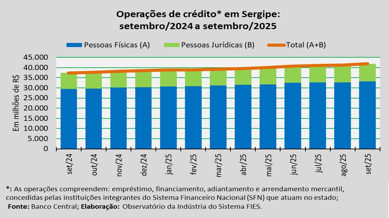 Análise realizada pelo Observatório da Indústria do Sistema FIES, com base nos dados do Banco Central, revelou que o saldo total das operações de crédito em Sergipe totalizou R$ 41,9 bilhões, no mês de setembro de 2025.