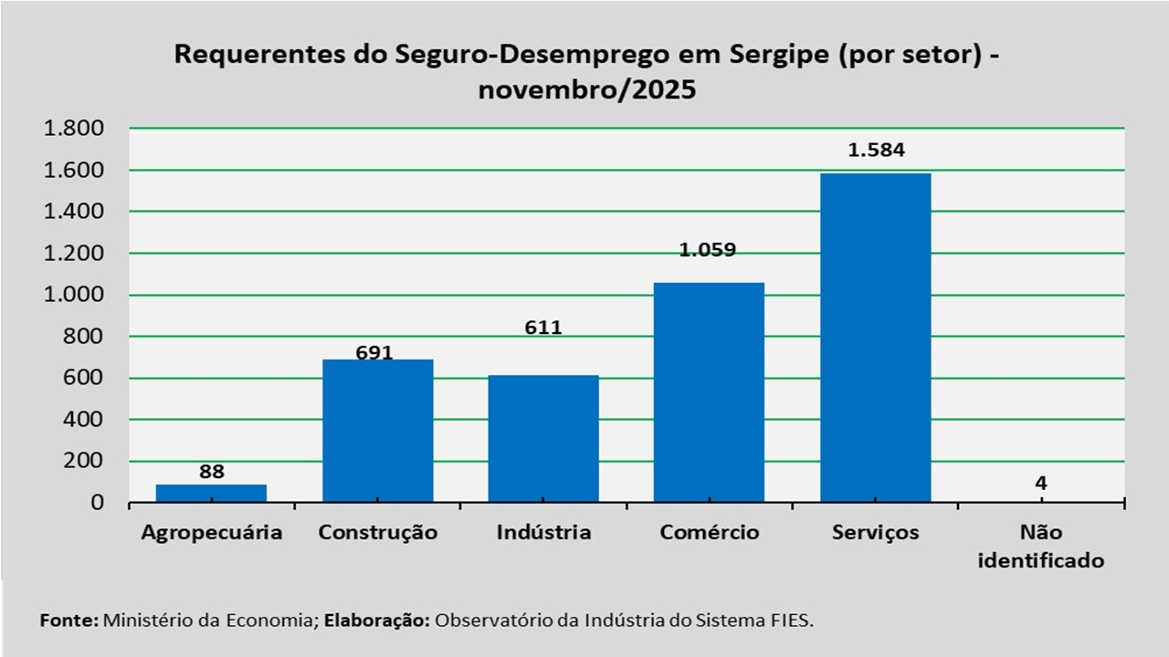 Análise realizada pelo Observatório da Indústria do Sistema FIES, com base nos dados do Ministério do Trabalho e Emprego, revelou que, em novembro último, 4.037 trabalhadores solicitaram o seguro-desemprego em Sergipe.
