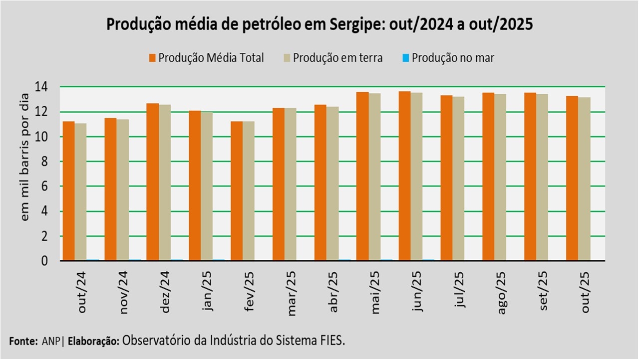 Análise realizada pelo Observatório da Indústria do Sistema FIES, com base nos dados da Agência Nacional do Petróleo, Gás Natural e Biocombustíveis (ANP), revelou que a produção de petróleo no estado, no mês de outubro, alcançou a média de 13,2 mil barris por dia (bpd), registrando um decréscimo de 2,1% em relação à produção média do mês anterior (setembro/2025). No comparativo com outubro de 2024, verificou-se acréscimo de 18,1%.