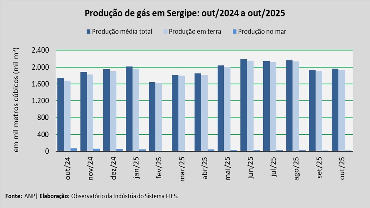 A produção em terra foi a principal fonte de produção de gás natural no estado, totalizando aproximadamente 1,94 milhão de metros cúbicos (m³), no período analisado. Esse volume correspondeu a 99,0% do total produzido em outubro de 2025 no estado, ao passo que a produção em mar foi cerca de 20 mil metros cúbicos (m³), representando 1,0% da produção.