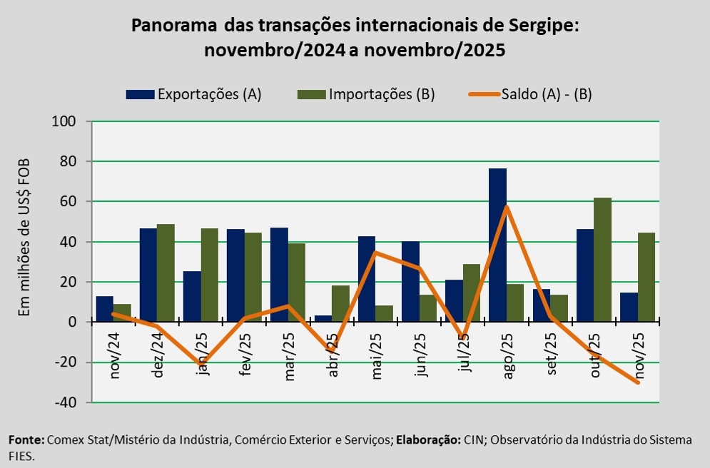 Análise realizada pelo Centro Internacional de Negócios – CIN/SE, da Federação das Indústrias do Estado de Sergipe (FIES), com base nos dados do Comex Stat, sistema para consultas e extração de dados do comércio exterior brasileiro, disponibilizado pelo Mistério da Indústria, Comércio Exterior e Serviços, apontou que as exportações sergipanas, em novembro de 2025, somaram US$ 14,5 milhões. O montante registrado representa crescimento de 11,1%, quando comparado a novembro de 2024. Já na comparação com o mês anterior, outubro último, verificou-se decréscimo de 68,6% nas exportações do estado.