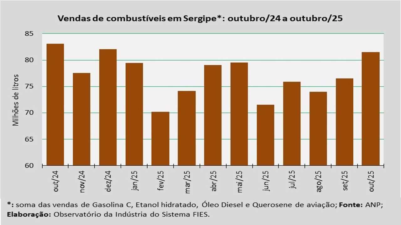 Análise realizada pelo Observatório da Indústria do Sistema FIES, com base nos dados da Agência Nacional do Petróleo, Gás Natural e Biocombustíveis (ANP), indicou que as vendas totais de combustíveis em Sergipe, em outubro de 2025, somaram aproximadamente 81,5 milhões de litros, assinalando um decréscimo de 1,9% quando comparado a outubro de 2024. Em relação ao mês imediatamente anterior (setembro/2025), as vendas aumentaram 6,5%.