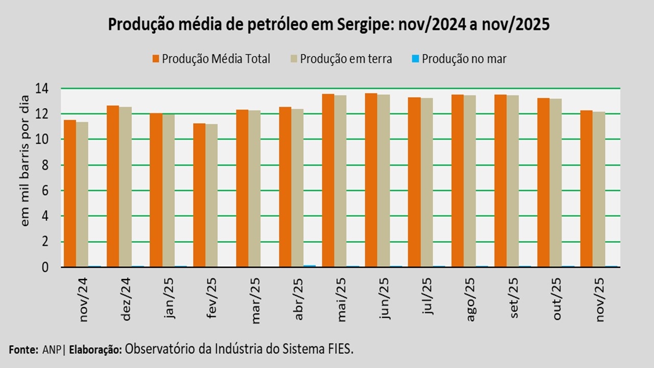 Análise realizada pelo Observatório da Indústria do Sistema FIES, com base nos dados da Agência Nacional do Petróleo, Gás Natural e Biocombustíveis (ANP), revelou que a produção de petróleo no estado, no mês de novembro, alcançou a média de 12,3 mil barris por dia (bpd), registrando um decréscimo de 7,4% em relação à produção média do mês anterior (outubro/2025). No comparativo com novembro de 2024, verificou-se acréscimo de 6,7%.