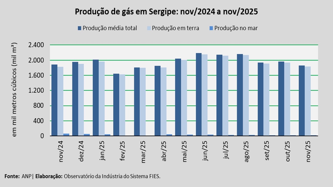 A produção em terra foi a principal fonte de produção de gás natural no estado, totalizando aproximadamente 1,84 milhão de metros cúbicos (m³), no período analisado. Esse volume correspondeu a 98,8% do total produzido em novembro de 2025 no estado, ao passo que a produção em mar foi cerca de 23 mil metros cúbicos (m³), representando 1,2% da produção.