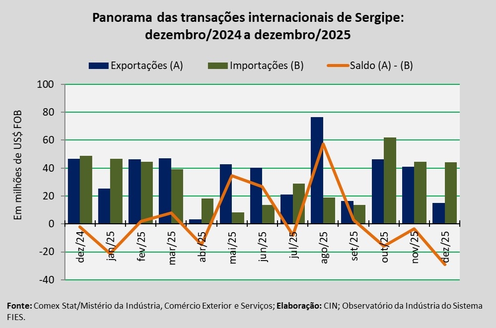 Análise realizada pelo Centro Internacional de Negócios – CIN/SE, da Federação das Indústrias do Estado de Sergipe (FIES), com base nos dados do Comex Stat, sistema para consultas e extração de dados do comércio exterior brasileiro, disponibilizado pelo Mistério da Indústria, Comércio Exterior e Serviços, apontou que as exportações sergipanas, em dezembro de 2025, somaram aproximadamente US$ 15,0 milhões. O montante registrado representa redução de 67,9%, quando comparado a dezembro de 2024. Já na comparação com o mês anterior, novembro último, verificou-se decréscimo de 63,6% nas exportações do estado.