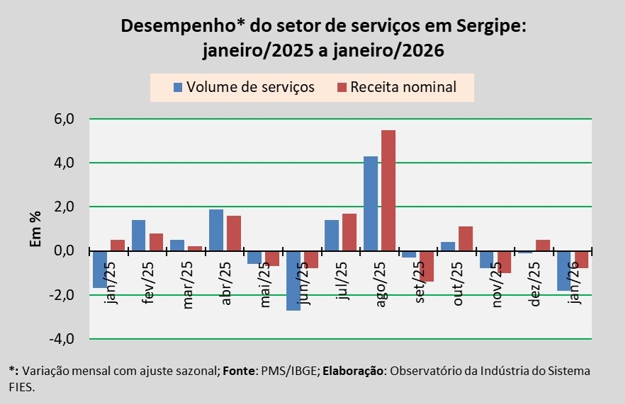 Análise realizada pelo Observatório da Indústria do Sistema FIES, com base nos dados da Pesquisa Mensal de Serviços (PMS) do IBGE, revelou que, em janeiro, o setor de serviços em Sergipe apresentou redução de 1,8% no volume de serviços prestados, em relação ao último mês de dezembro, na série com ajuste sazonal (método utilizado para uniformizar os períodos de comparação). Na comparação com janeiro de 2025, o volume de serviços assinalou crescimento de 3,0%. Já no acumulado dos últimos doze meses, o aumento registrado foi de 4,7%.